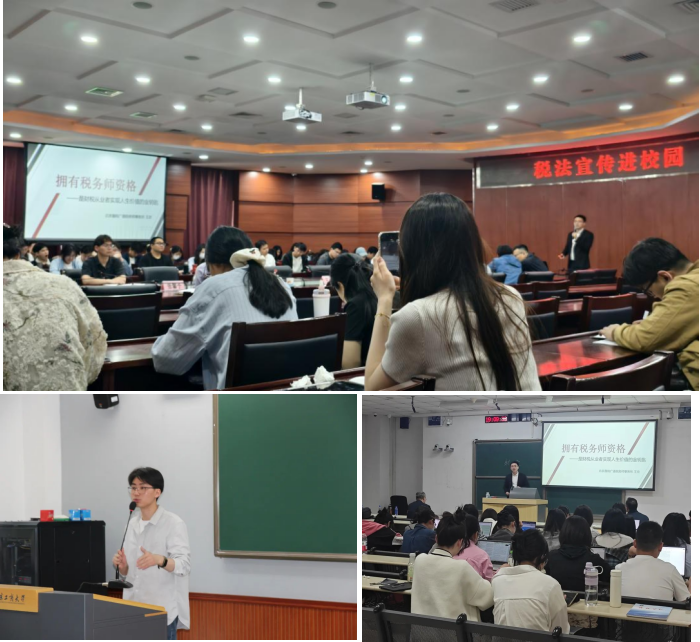 鑫稅廣通項(xiàng)目經(jīng)理王京則是以從業(yè)人員視角向大家介紹了擁有稅務(wù)師資格證書的重要性。他圍繞“擁有稅務(wù)師資格是財(cái)稅從業(yè)者實(shí)現(xiàn)人生價(jià)值的金鑰匙”結(jié)合第34個(gè)全國稅收宣傳月主題,深入淺出地解析了稅務(wù)師行業(yè)的現(xiàn)狀、發(fā)展趨勢及社會價(jià)值。他從夯實(shí)專業(yè)知識根基切入,結(jié)合優(yōu)化營商環(huán)境的時(shí)代需求,深入淺出地剖析稅務(wù)師在經(jīng)濟(jì)社會發(fā)展中的重要角色。他指出,在企業(yè)合規(guī)需求激增的當(dāng)下,稅務(wù)師職業(yè)資格考試已成為培養(yǎng)高端涉稅專業(yè)人才的“敲門磚”。他鼓勵(lì)同學(xué)們把握機(jī)遇,積極報(bào)考,以考促學(xué),在備考過程中實(shí)現(xiàn)知識儲備與職業(yè)能力的雙提升,為未來在財(cái)稅領(lǐng)域乘風(fēng)破浪、逐夢前行打下堅(jiān)實(shí)基礎(chǔ)。