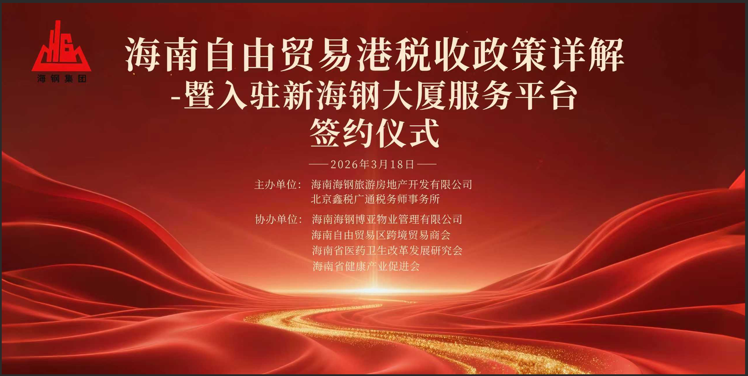 2026年3月18日下午,由海南海鋼旅游房地產(chǎn)開(kāi)發(fā)有限公司與北京鑫稅廣通稅務(wù)師事務(wù)所聯(lián)合主辦的“海南自由貿(mào)易港稅收政策詳解暨入駐新海鋼大廈服務(wù)平臺(tái)簽約儀式”在??谑行潞d摯髲B隆重舉行。此次活動(dòng)由海南海鋼博亞物業(yè)管理有限公司、海南自由貿(mào)易區(qū)跨境貿(mào)易商會(huì)、海南省醫(yī)藥衛(wèi)生改革發(fā)展研究會(huì)以及海南省健康產(chǎn)業(yè)促進(jìn)會(huì)聯(lián)合協(xié)辦。我公司董事長(zhǎng)王進(jìn)以及咨詢部項(xiàng)目經(jīng)理王拴拴一行應(yīng)邀參加。來(lái)自全市各地的企業(yè)代表、行業(yè)精英及專家學(xué)者齊聚一堂,共同探討自貿(mào)港背景下的政策紅利與發(fā)展機(jī)遇。
